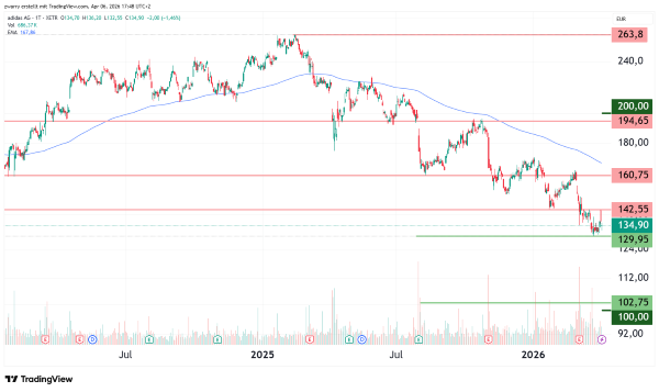 Der Aktienkurs von Adidas notiert seit 10. März 2025 unter dem 200-Tage-EMA (exponentiell gleitender Durchschnitt), was längerfristig betrachtet auf eine Abwärtssequenz hindeutet. Mittlerweile wurde ein Kursniveau erreicht, das zuletzt vor der Ablösung des ehemaligen CEO Kasper Rorsted im Oktober 2022 gehandelt wurde. Blickt man weiter zurück, findet sich dieses Niveau bereits Mitte August 2016. Damals lag das Kurs-Gewinn-Verhältnis (KGV) bei 29,58. Im Jahr 2022 war das KGV mit 38,18 sogar deutlich höher. Seit Februar 2025 ist der Gewinn pro Aktie gestiegen, während der Aktienkurs nachgegeben hat. Die Konsensschätzung für das erwartete KGV im Jahr 2028 liegt mittlerweile bei 10,02 und entspricht damit dem niedrigsten Wert der vergangenen zehn Jahre. Vor diesem Hintergrund erscheint die Aktie als unterbewertet. Derzeit notiert sie bei 134,90 Euro und hat kurzfristig betrachtet einen Boden ausgebildet. Im Vergleich zum Jahreshoch vom 13. Februar 2025 bei 263,80 Euro ist der Börsenwert des Dax-Konzerns um mehr als 48 Prozent gesunken. Das Tief vom 23. März 2026 bei 129,95 Euro lag deutlich unter der 200-Tage-Linie und deutet auf einen überverkauften Status hin. Die anschließende Gegenbewegung nach oben kann als natürliche Reaktion gewertet werden.