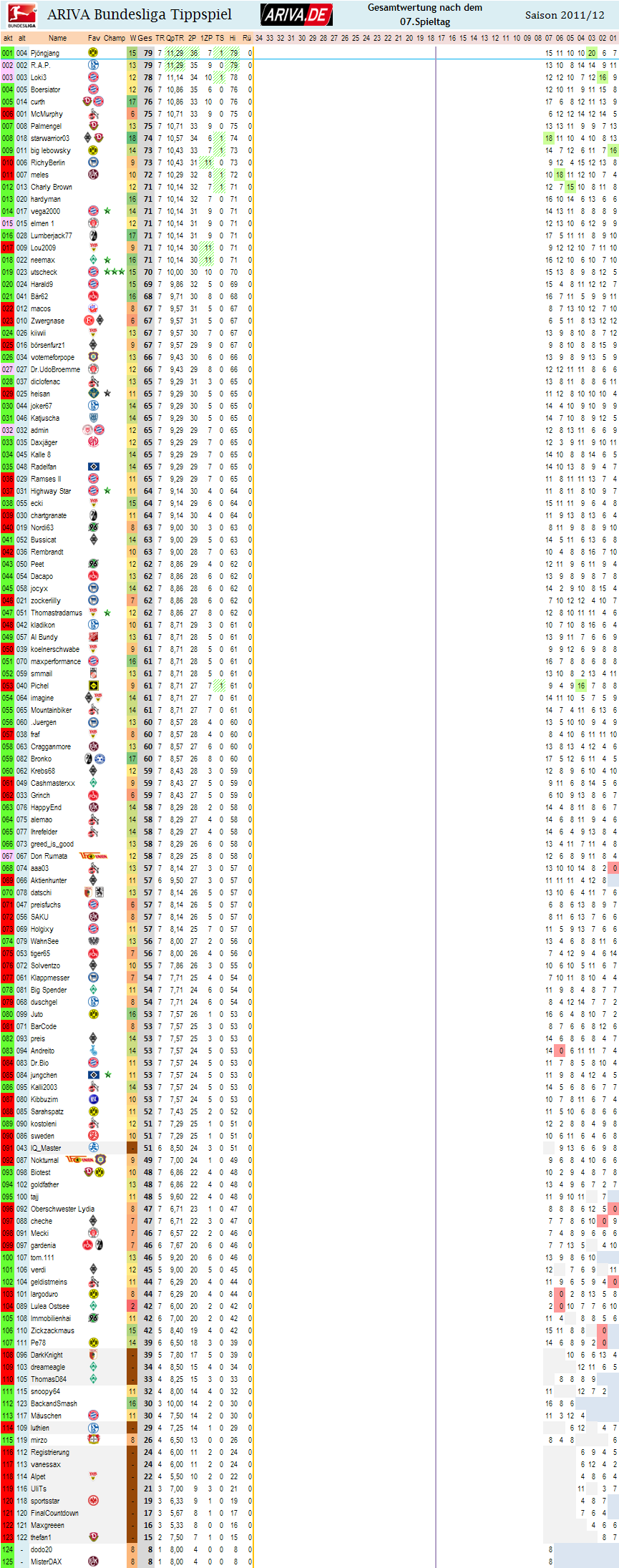 Grinch oist übrigens in die Ewige Top 100 vorgestoßen und belegt eben nun den 100. Platz dort! In selbiger Liste hat es Charly Brown geschafft an diesem 8. Spieltag der Saison 2011/12 insgesamt die 1.000 Punkte Marke zu durchbrechen.. Momentan ist er auf Platz 38 in der Ewigen Liste..
