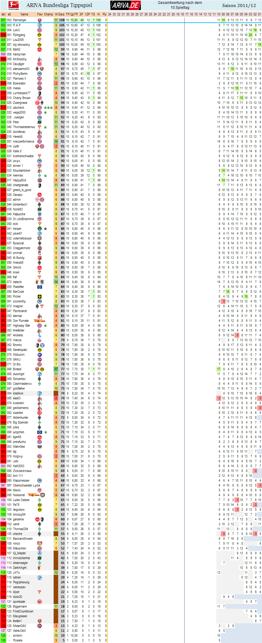 Grandios ist in Sachen Punktschnitt ist natürlich utscheck, der FC Bayern des Tippspiels zur 1.BL.. :o)) nach 316 Tipprunden immer noch über 10 Punkte im Schnitt!!! Der Beste von den Spielern mit mehr als 100 Tipprunden ist joker67 vom Schnitt her..