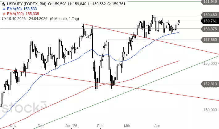 Um die Abwärtsbewegung der letzten Tage zu beenden, müsste EUR/USD über 1,1722 USD nach oben ausbrechen. Dann wäre eine Rally an das Hoch bei 1,1849 USD und später sogar an das Jahreshoch bei 1,2082 USD möglich. Ein Rückfall unter die Unterstützungszone könnte weitere Abgaben bis 1,1640 USD auslösen. Dort liegt die Triggerlinie für eine Bodenformation, die am 08. April 2025 vollendet wurde. Ein Rückfall unter diese würde vermutlich zu weiteren Abgaben in Richtung 1,1599 USD führen.