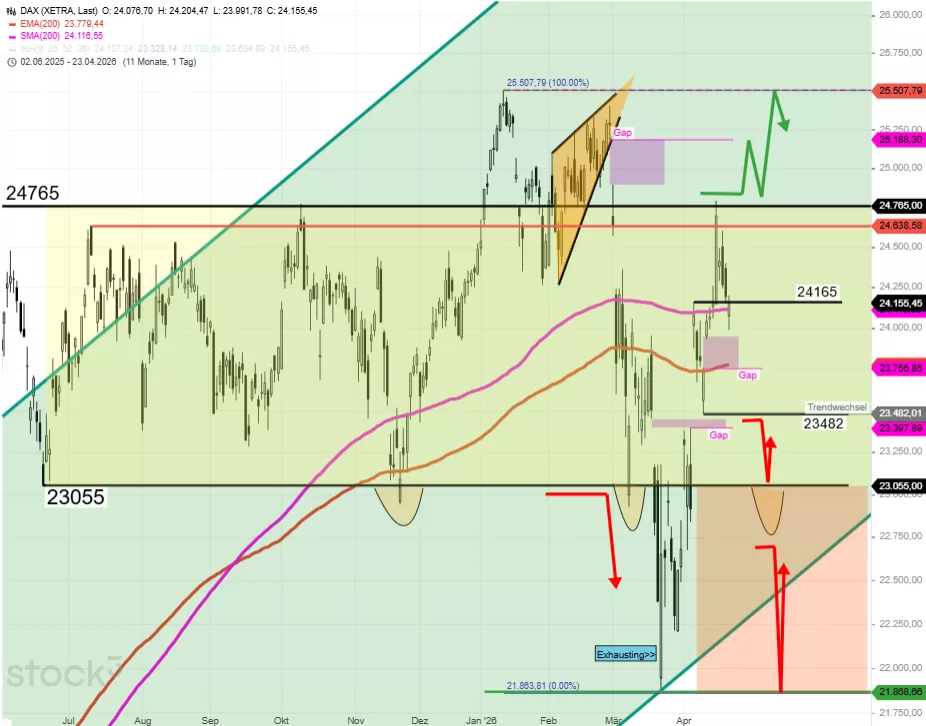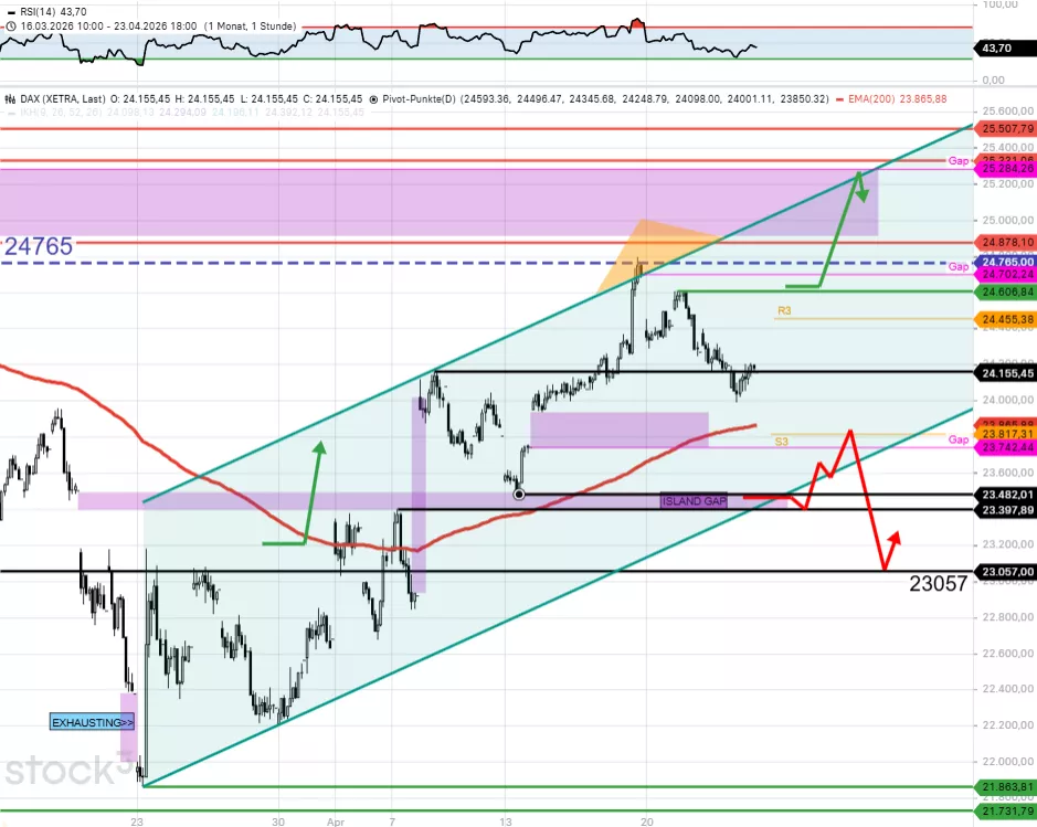 Der DAX bleibt über 23.482 im kurzfristigen Aufwärtstrend. Unter 23.482 würde der DAX bis 23.400 (Island Gap) und später bis ca. 23.060/23.050 fallen. Der kurzfristige Aufwärtstrend bekommt aber erst wieder neuen Schwung, wenn es den Marktteilnehmern gelingt, das Börsenbarometer über das letzte tiefere Hoch bei 24.607 anzuheben. Oberhalb von 24.607 könnte sich der DAX um das Vorwochenhoch 24.792 kümmern und darüber um das alte Gap 25.284. Zwischen 24.382 und 24.607 gibt es unendliche Möglichkeiten. Es lohnt nicht, diese näher zu besprechen. Dennoch einige Hinweise: Der obere Vola-Max-Punkt R3 ist heute 24.455. Der untere Vola-Extrem-Punkt S3 ist heute 23.817. DAX 24.155 hat eine stützende Funktion, ebenso wie der Bereich 24.130/24.120.