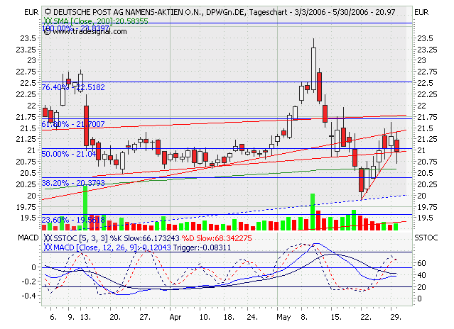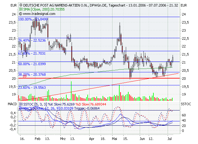 Rückblick: Die Aktie der DEUTSCHEN POST markierte nach mittelfristiger Aufwärtsbewegung im Februar 2006 ein Zwischenhoch bei 23,85 Euro, nur knapp unterhalb des AllTimeHighs bei 24,78 Euro, und startete eine Abwärtskorrektur. Mitte Juni rutschte die Aktie dann unter die exp. GDL 200 (EMA200) auf Tagesbasis zurück. Die Aktie fiel erneut auf die Aufwärtstrendlinie seit März 2003 zurück. Insgesamt ist das seitwärts gerichtete Bewegungmuster seit Mai wenig bullisch zu werten, weshalb das kurzfristige Chartbild einen leicht bärischen Beigeschmack erhält.