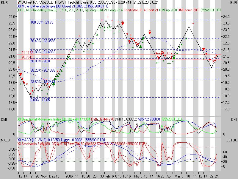 Die Deutsche Post AG strebt in ihrem Expressbereich langfristig eine deutlich höhere Rendite an als derzeit. Nach 2009 sei eine EBIT-Marge von 10% geplant, sagte Express-Finanzvorstand Oliver Gritz am Dienstag auf einer im Internet übertragenen Analystenkonferenz in New York. In den ersten neun Monaten dieses Jahre betrug das Verhältnis vom Umsatz zum Ergebnis vor Zinsen und Steuern erst 0,7%. Der gesamte Expressbereich ist durch hohe Verluste im US-Geschäft in Mitleidenschaft gezogen.Die Deutsche Post Aktie bewegte sich in einem langfristigen intakten Aufwärtstrendkanal. Aus diesem ist sie signifikant nach unten ausgebrochen, jedoch im weiteren Verlauf (am 21.09.2006) erneut in den Aufwärtstrendkanal eingetreten. Dadurch hat sich das Chartbild wieder verbessert, denn es besteht nun die Hoffnung, dass die Deutsche Post Aktie Ihren langfristigen Aufwärtstrend fortsetzt. Erst bei einem weiteren signifikanten Ausbruch aus dem Aufwärtstrendkanal würde sich das Chartbild erneut verschlechtern. Die Kursentwicklung bestätigt somit wieder den bisher aussichtsreichen Chartverlauf. Aus diesem Grund können die Aktien-Positionen wieder unter Beachtung der Indikatorenanalyse aufgebaut werden.