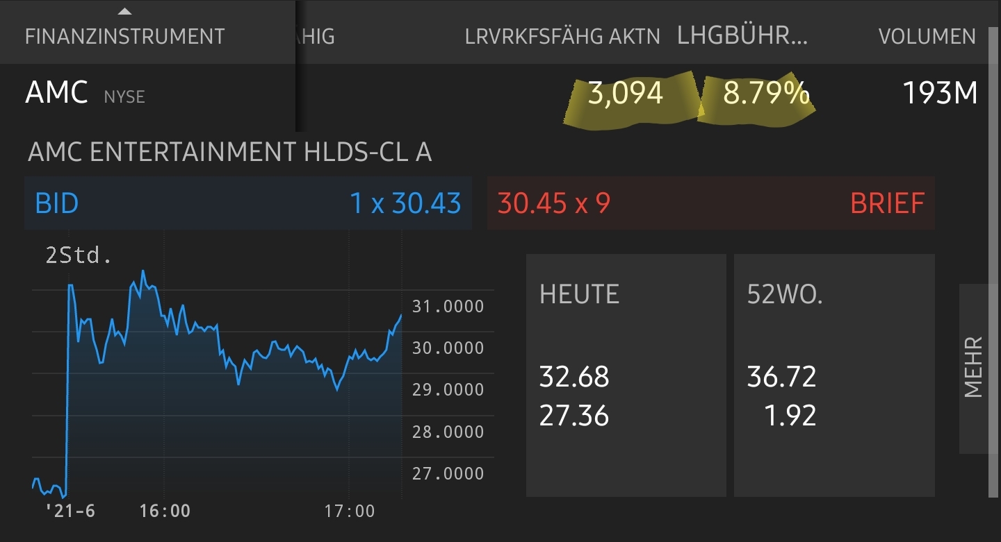 Nachdem der Hype um die in Schwierigkeiten geratene Kinokette AMC bereits seit Wochenbeginn anhält, erreichte er am Mittwoch seinen vorläufigen Höhepunkt. Bereits vorbörslich wies der Wert ein Plus von 23 Prozent aus. Gegen Mittag deutscher Zeit durchbrach der Anteilschein die rote Linie und erreichte bei 36 Euro sein Allzeithoch.