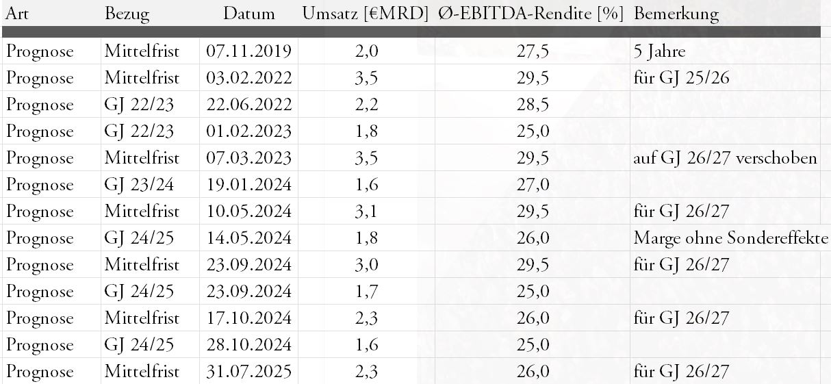 Wie sollen die Analysten es dann besser wissen als der Konzern, der, wenn ich mir all die verfehlten Prognosen anschaue, leider auch meist im Dunkeln tappt. Eines der Beispiele wurde ja auch schon genannt: 26/27 wir prognostiziert, 25/26 noch nicht.