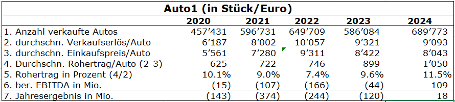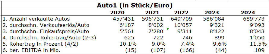 Im Durchschnitt wurden 690.000 Autos zu ca. 8.000 Euro angekauft und zu ca. 9.000 Euro verkauft. Die Bruttomarge/Auto wurde dabei kontinuierlich gesteigert und liegt in 2024 bei immerhin durchschnittlich 1.050 Euro.