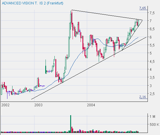 Die Experten würden erwarten, dass die positive Entwicklung bei Advanced Vision Technology auch in den kommenden Quartalen anhalte. Bei einem Aktienkurs von 5,12 Euro und 3,82 Euro Cash/Aktie sei das operative Unternehmen nur mit 1,30 Euro/Aktie bewertet. Das bedeute bei einem erwarteten Gewinn pro Aktie von 0,35 Euro im Jahr 2004 ein KGV von nur 3,7. Würde man die Firma auf Basis des erwarteten 2005er Gewinnes von 0,59 Euro/Aktie betrachten, so läge das KGV für den operativen Betrieb gar nur bei 2,2 (!).