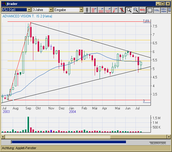 Aber: Wir bummeln immer noch unter 6 Euro, die Situation wird interessanter. Zur Zeit 5,20 Euro - also voll im Plan, billiger wird's nicht Leute. Wir kommen der Spitze aus Abwärts- und Aufwärtslinie immer näher. Spätestens Mitte August sollten wir einen neuen Trend sehen, meine Prognose: AUFWÄRTS.