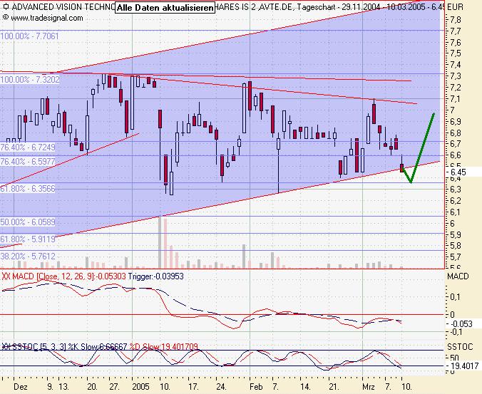 Ganze vier Mal innerhalb des letzten Jahres ist die Aktie von Advanced Vision Technology (WKN 931.340, Ticker VSJ, ISIN IL0010837248) an der 6-Euro-Marke gescheitert. Nach dem Einstieg des Fidelity-Fonds (hat bereits 6 % der Aktien aufgekauft) läuft derzeit die nächste Attacke auf diese 'Betonmauer' an. Aus Händlerkreisen hören wir, dass einige große Kaufaufträge im Markt liegen. Gelingt der charttechnische Ausbruch nach oben, könnte der Wert im Nu bis zum nächsten Widerstand bei 7,50 Euro laufen. Prallt die Aktie abermals ab, sind für die kommenden Wochen wieder Kurse in der Region von 5,50 Euro zu erwarten.
