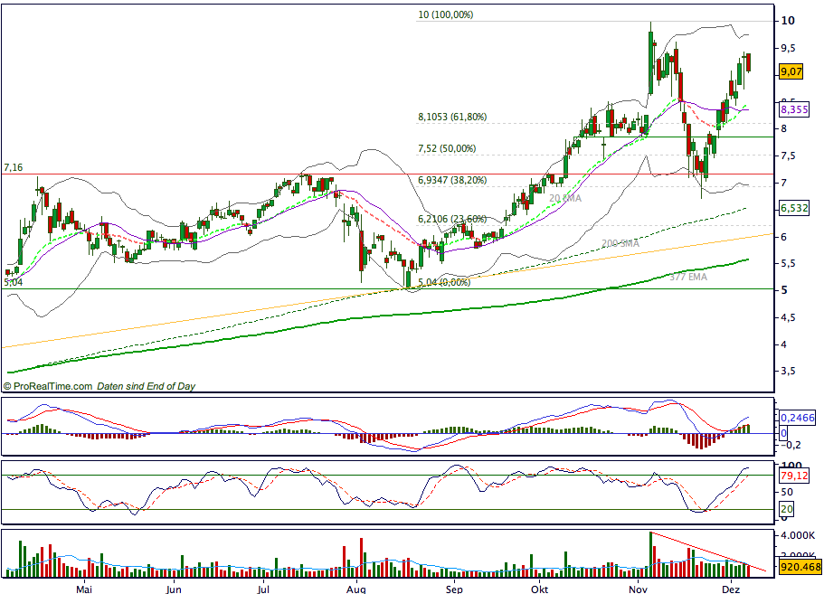 Positiv ist zu werten, dass der Bereich 7,00 - 7,16 nicht per SK unterschritten wurde, sodass dieser nun eine ziemlich feste Unterstützung bildet. Wer recht skeptisch ist, könnte je nach EK zwischen 7,90 und 8,10 absichern, noch enger wäre ein Stopp an der Mittellinie der Bollinger (8,35) oder der 20er EMA (8,50). An diesen Marken setze ich öfter SL, um kurze, bereits ins Plus gelaufene Trades abzusichern.