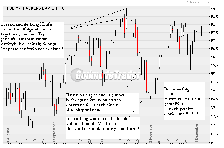 1.Man wartet auf einen Umkehrpunkt und geht dann long oder short auf den DAX oder ausnahmsweise wenn kein Umkehrpunkt in Sichtweite ist geht man trendfolgend long oder short.