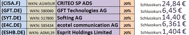KCO.DE Klöckner 9,921€ 20% SZG.DE Salzgitter 31,000€ 20% DBK.DE Deutsche Bank 34,675€ 20% EOAN.DE Eon 13,415€ 20% PAH3.DE Porsche 75,660€ 20%