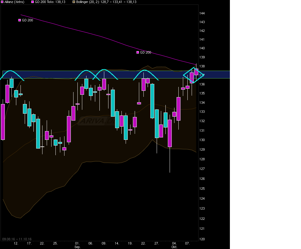 und jetzt bitte auch weiter verteidigen und sich eher Richtung 141,95 orientieren. Die  Zahlensaison beginnt wieder und Draghi wird heute auch noch Äußerungen abgeben, wie es mit dem Ankaufprogramm weitergeht. Hoffen wir mal da kommt von der Seite keine Störungen für den Gesamtmarkt, da die Allianz sensibel auf Gesamtmarktbewegungen reagiert. Die Allianz hatte im Q.3 eigentlich keine wirklich übermäßig große Schadensfälle zu begleichen, die einen aus den Tritt bringen könnten. Von daher sollten die Zahlen vermutlich weiterhin mindestens im Plan bleiben, wenn keine sonstigen Sonderfaktoren noch hinzukommen. Störend ist weiterhin für Banken&Versicherungen die Zinslage, die von den Notenbanken niedrig gehalten wird.