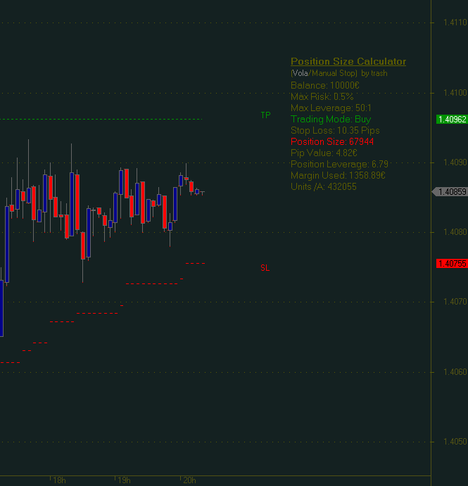 Unten sieht man einen Chart eines beliebigen Underlyings aus dem Währungsbereich, dass jetzt hier mal als Bsp dienen soll. In dem Chart ist ein Rechner integriert, der mir die Arbeit ohne viel Kopfrechnen erleichert. Sowas kann sich jeder auch einfach mit Excel erstellen. Ich habe es mit ins Programm eingefügt und habe somit komfortabel alles auf einen Blick und wird real-time angepasst.
