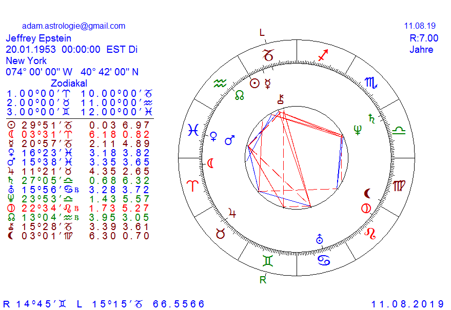 leider habe ich kein Uhrzeit zu diesem radix, ich wollte mal sehen welche Planeten für seine sexuellen Ausschweifungen stehen und ob man etwas dazu sehen kann. Eines fällt auf dem ersten Blick sofort auf, er hat die beiden sexualplaneten VE und MA in gradgenauer Konj. im Zeichen Fische, das kann schon mal eine leidenschaft anzeigen, aber noch nicht, dass man deswegen kriminell wird, da müssen wir noch weiter suchen und da ich keine häuser habe, probiere ich es mal mit einer Pla kette, heisst die Herrscher über die jeweiligen Zeichen, in diesem Falle ist NE der Herrscher über MA und VE und dieser steht in Konj in der Waage mit SA, heisst er neigt sehr oft dazu, die wahren absichten hinter einer Fassade des Edelmann und Millionärs zu verstecken und es besteht die Gefahr bei dieser Konstell. sich seiner Verantwortung anderen gegenüber zu entziehen, indem er seine schwächen und leidenschaften und seine sex.Neigungen sehr egoistisch zum Ausdruck bringt, in diesem Falle ist der NE die Maske des Biedermann , sobald er sich seinen potentiellen Opfern nähert. ME im Stbk sagt uns, dass er seine Sache gründlich und genauestens plant und dass er aussergewöhliche Ideen hat um andere zu überzeugen, sich bei ihm zu beteiligen und mitzumachen, doch dieser ME steht im Quadr zu NE/SA und in Opp zu UR im Krebs, man könnte sagen, Münchhausen war eine Miniaturausgabe im Verhältnis, solche menschen können das blaue von himmel erzählen und dem ME im Stbk glaubt man das auch noch, weil es dementsprechend ernsthaft rüber kommt. Natürlich ME Quadr NE verleitet dazu, die Menschen am ende getäuscht und enttäuscht zu haben, es geht soweit, dass man zuletzt die eigenen lügen auch selber glaubt und dadurch eine noch wahrhaftigere Überzeugung bewirkt, jedoch aus dem labyrinth der eigenen wahnvorstellungen nicht mehr selbst herausfindet, karmisch gesehen belügt man sich selbst und alle anderen, bis zum bitteren Ende. man sollte wissen, MA/VE und Fis ist wie eine verschmelzung, die in extremen fällen dazu führt, dass man selbst nicht mehr weiß, ob man männschen oder weibchen ist, denn gerade der MA in Fis steht dort auch für eine gewisse labilität in sex.Fragen, aber auch für verführung und verführt werden, gepaart mit der VE. dazu sehe SO,MO,MA und UR in schlechten Zeichen stehen und die einen reichen mann, JU im Stier, privat und intim sehr unfertig aussehen lassen, was er dann selbst wie es aussieht, mit kriminellen handlungen kompensierte. sein tod erfolgte mit MA tra. über PL, auch gewaltsam möglich und SO,VE über dem abstg.MK, dazu kommt ME R trans Opp ME, die vorangegangen trans der einzelnen Pla über UR brachten alles an die Öffentlichkeit, dort steht auch momentan der aufstg.MK trans. in Konj mit seinen UR im Krebs und das gradgenau. |