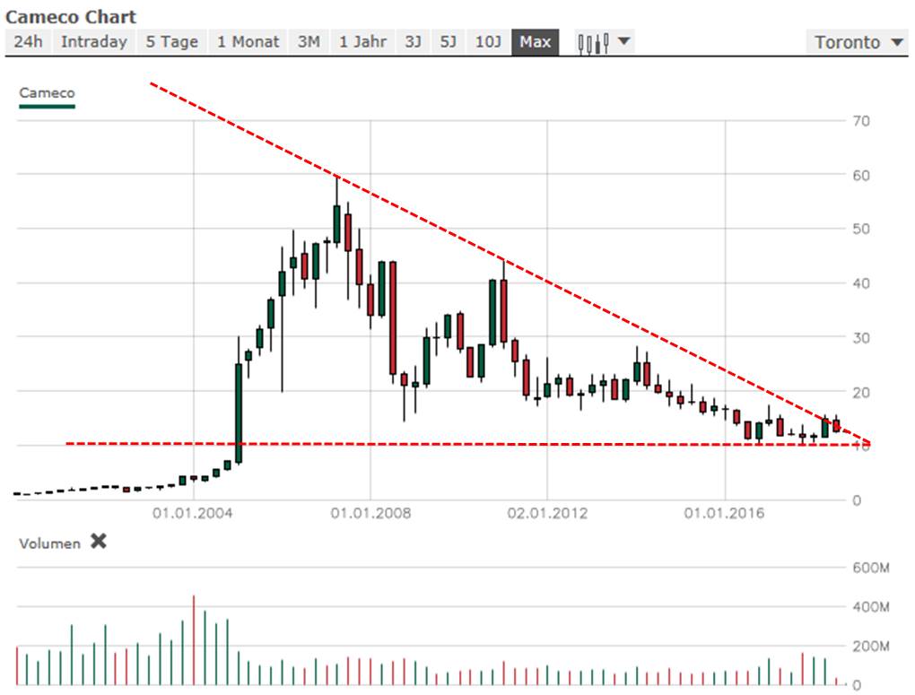 | Kurzfristig glaube ich nicht! Warum? Weil Cameco langjährige Abnahmeverträge mit höheren Preisen als der Spot-Markt die letzten Jahre hergegeben hat, abgeschlossen hatte. 60% laufen hier über diese Verträge. Nur 40% über Spot-´Markt. Jetzt laufen die Verträge langsam aus und Cameco bekommt ein Problem, da sie die Verträge erneuern müssen und zwar zu niederigeren Preisen. Es sei denn Cameco entscheidet sich für 100% Spot-Markt. Kann ich mir nicht vorstellen, da der Ladenextrem konservativ agiert. Langzeit-Chart liest sich spannend aber ich rechne hier weiterhin mit fallenden Kursen bis 10 CAN. Nächste Haltelinien aktuell bei 12,38 und 11,54 |