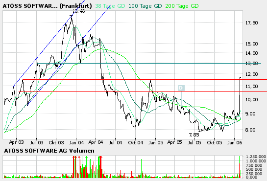 Zudem setzt sich damit bei ATOSS die erfreuliche Entwicklung seit dem vierten Quartal 2005 fort. Der Vorstand bleibt trotzdem noch bei einem vorsichtigen Ausblick für das Geschäftsjahr 2006. Erwartet wird unverändert eine deutliche Ertragssteigerung gegenüber dem Vorjahr mit dem Ziel einer Umsatzmarge von 5% bezogen auf das EBIT. Eine Fortsetzung der Belebung des Geschäfts im Premium-Bereich könnte zu einer weiteren Verbesserung führen.