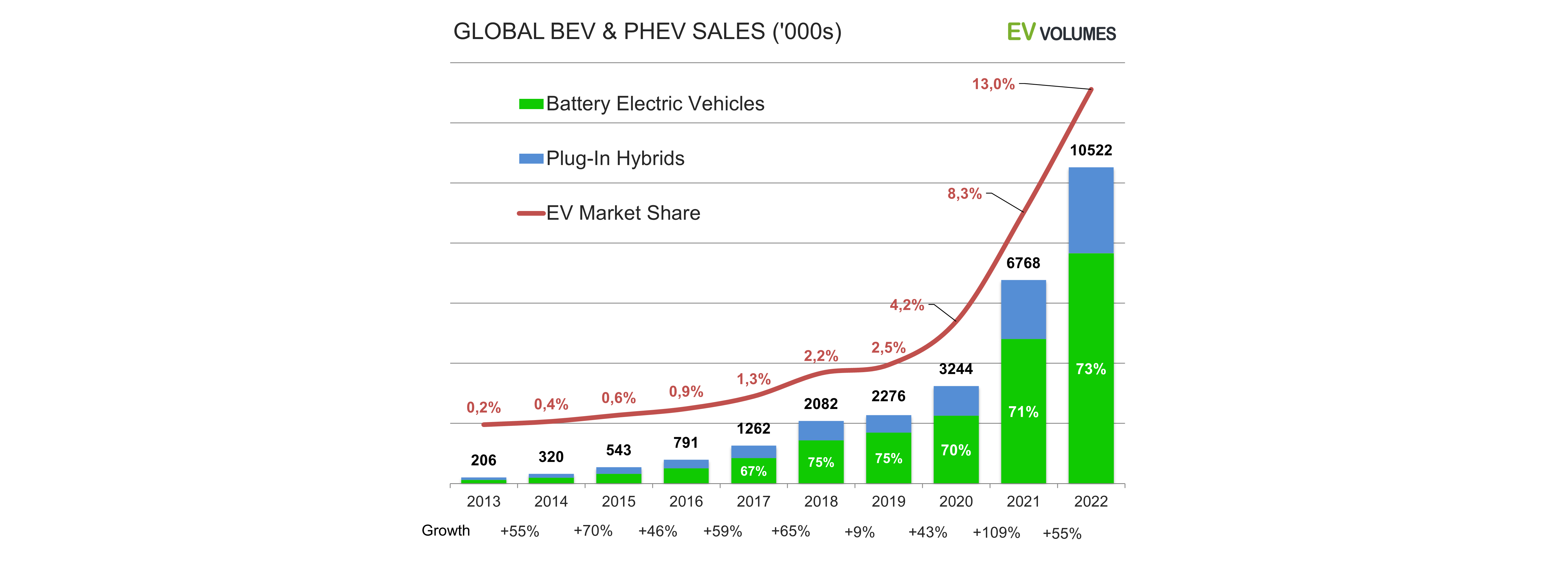 Schöne Graphik der weltweiten Sales 2013 - 2022 (siehe unten), Quelle: ev-volumes.com.