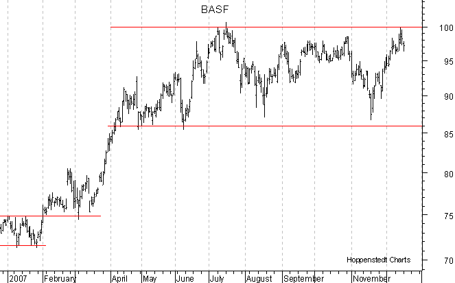 Die Experten vom "Frankfurter Tagesdienst" raten in die BASF-Aktie erst dann einzusteigen, wenn der Schlußkurs die Hürde von 100 Euro überwinden kann.