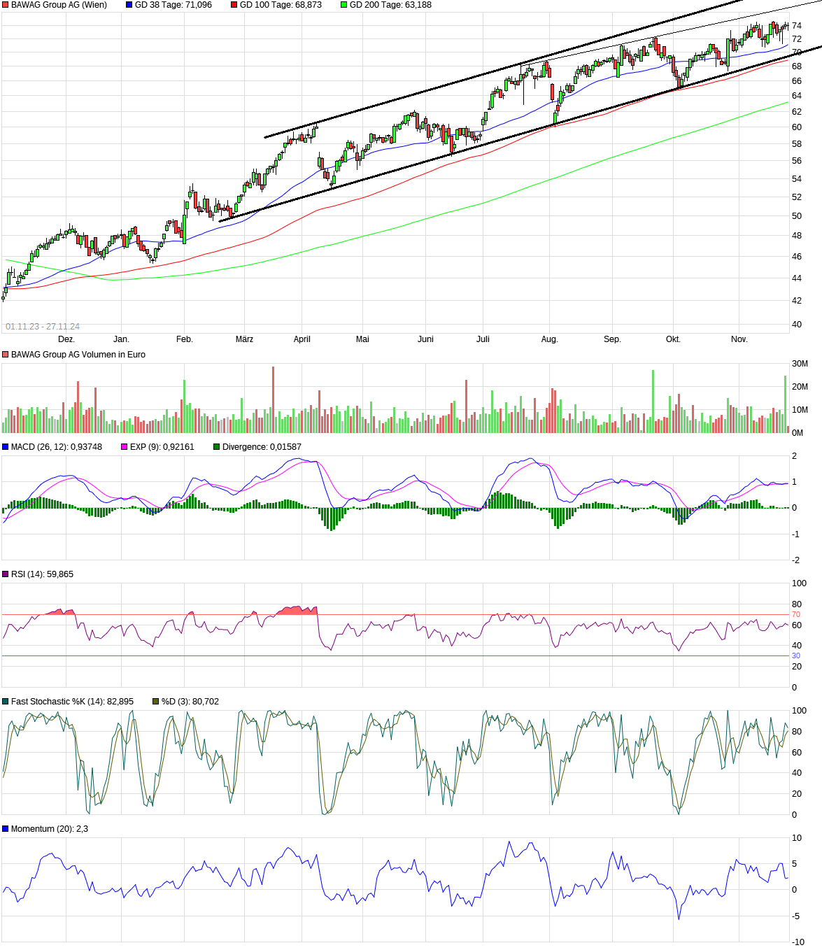 Charttechnisch geht es seit über einem Jahr aufwärts. Gelegentliche Ruhephasen in Form von Handelsspannen werden zum Einstieg genutzt. Und im Augenblick wird die Oberseite einer solchen Trading Zone bei 74,40 EUR angesteuert. Darüber könnte die Kletterpartie fortgesetzt werden.