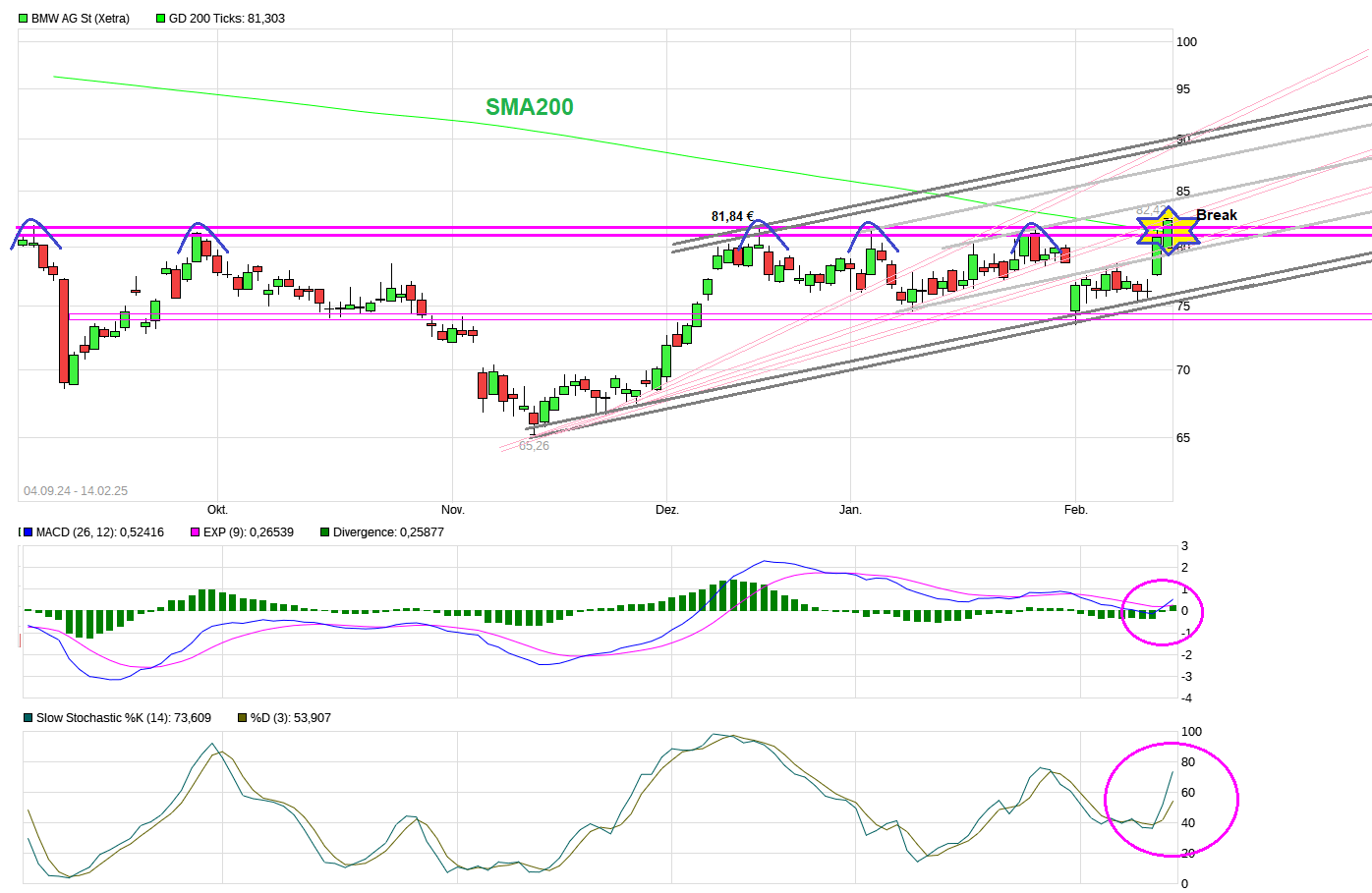 Der Gesamtmarkt ist weiter in der Trump 2.0. Euphorie, DAX rennt daher seit Monaten von einem Allzeithoch zum nächsten Allzeithoch. Die Autowerte kamen allerdings in der letzten Zeit nicht wirklich hinterher, da man Zollbefürchtungen hat, die aber vielleicht zu übertrieben sein könnten. Entsprechend wäre eine Abkehr von dieser übertriebene Angst ( siehe die Meldung unten) eine Gelegenheit endlich die Widerstandszone doch zu überwinden, was vielleicht dann auch noch einige technisch induzierte Anschlußkäufe generieren würde in Richtung 86/87€ . Aber noch ungelegtes Ei. Trotzdem werde ich mich mal spekulativ positionieren, jedoch mit recht enger Absicherung ;)