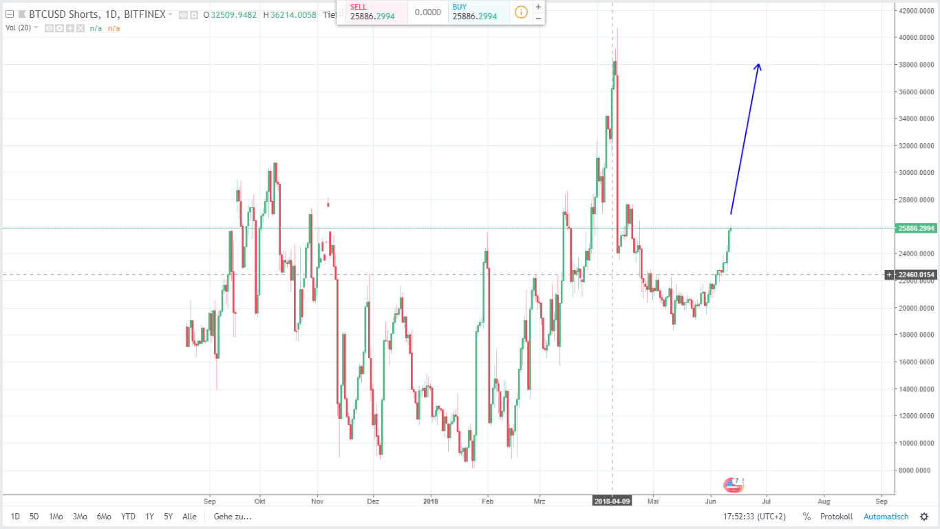 Es kann gut passieren, dass der gleiche Käufer, der im April sämtliche Shorts absorbiert hat, dies nun erneut tun wird und damit erneut einen Shortsqueeze auslösen könnte, ohne, dass der BTC unter die relevanten Chartmarken fällt.