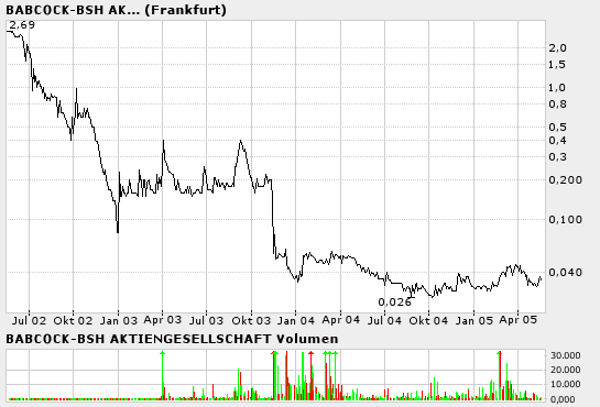 Kurshistorie | Frankfurt | | | Datum | Erster | Hoch | Tief | Letzter | Umsatz |  | 23.05.2005 | 0,046 | 0,046 | 0,038 | 0,038 | 164.5k |  | 20.05.2005 | 0,038 | 0,048 | 0,036 | 0,042 | 1.2M |  | 19.05.2005 | 0,035 | 0,040 | 0,035 | 0,040 | 405.5k |  | 18.05.2005 | 0,033 | 0,035 | 0,033 | 0,035 | 30.0k |  | 17.05.2005 | 0,034 | 0,034 | 0,032 | 0,034 | 1.2k |  | 16.05.2005 | 0,037 | 0,037 | 0,037 | 0,037 | 0 |  | 13.05.2005 | 0,033 | 0,037 | 0,033 | 0,037 | 39.0k |  | 12.05.2005 | 0,033 | 0,033 | 0,032 | 0,032 | 600 |  | 11.05.2005 | 0,031 | 0,036 | 0,031 | 0,036 | 30.2k |  | 10.05.2005 | 0,031 | 0,031 | 0,031 | 0,031 | 200 |  | 09.05.2005 | 0,030 | 0,036 | 0,030 | 0,031 | 92.2k |  | 06.05.2005 | 0,032 | 0,033 | 0,031 | 0,031 | 104.3k |  | 05.05.2005 | 0,032 | 0,033 | 0,032 | 0,033 | 600 |  | 04.05.2005 | 0,032 | 0,033 | 0,032 | 0,033 | 500 |  | 03.05.2005 | 0,031 | 0,034 | 0,031 | 0,034 | 15.6k |  | 02.05.2005 | 0,032 | 0,033 | 0,032 | 0,032 | 119.2k |  | 29.04.2005 | 0,033 | 0,033 | 0,033 | 0,033 | 0 |  | 28.04.2005 | 0,033 | 0,034 | 0,033 | 0,034 | 50 |  | 27.04.2005 | 0,033 | 0,033 | 0,033 | 0,033 | 0 | |