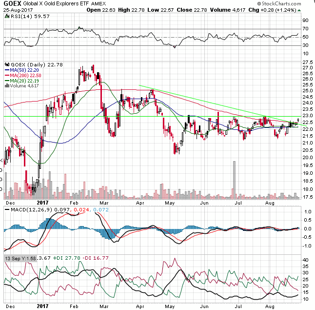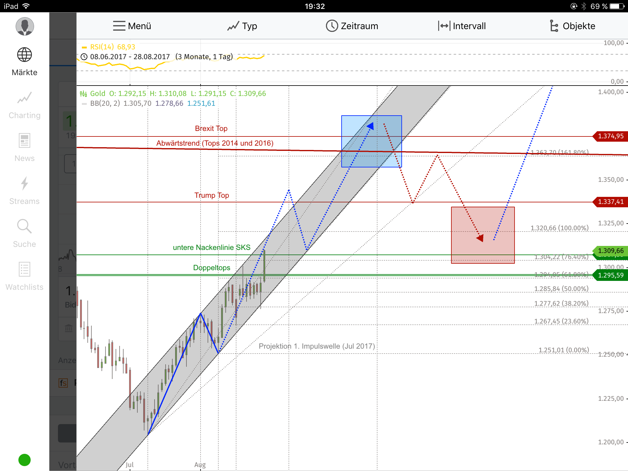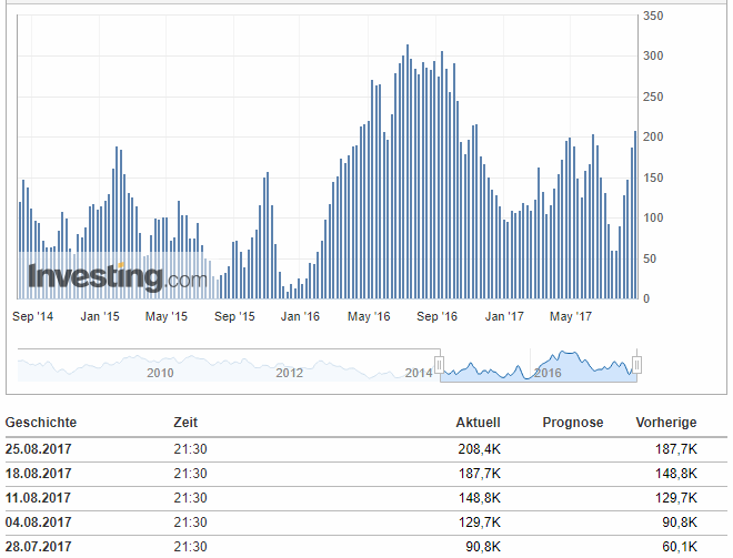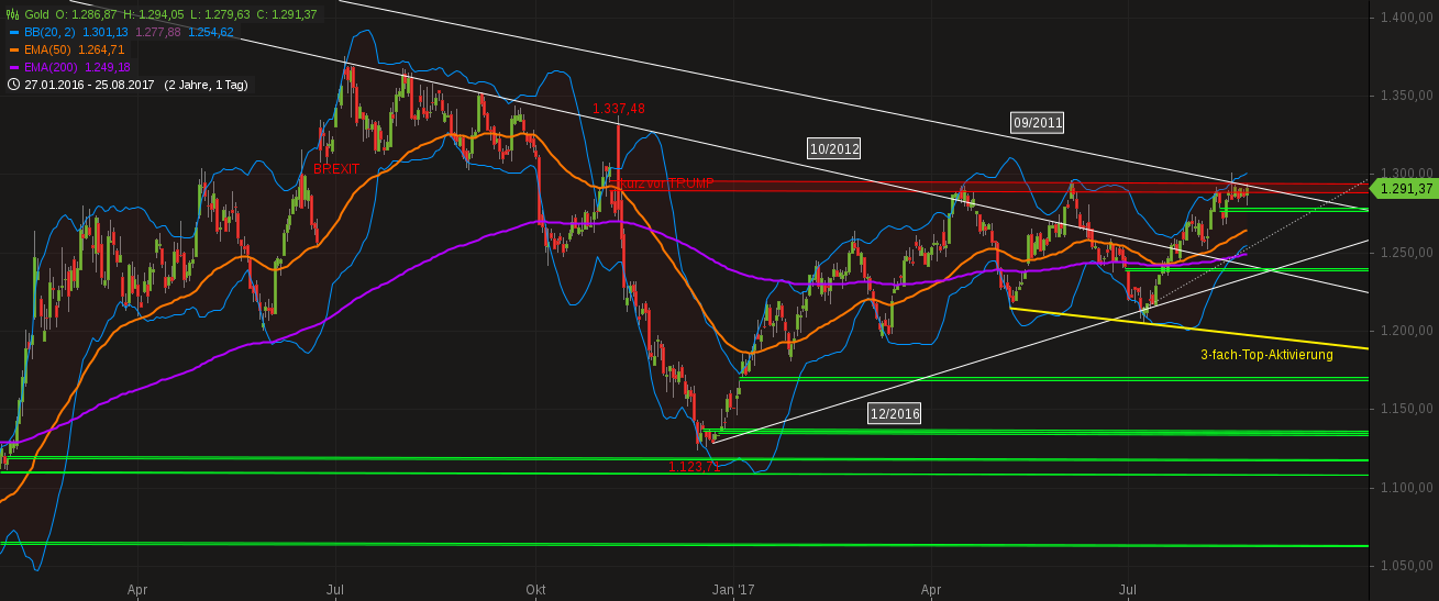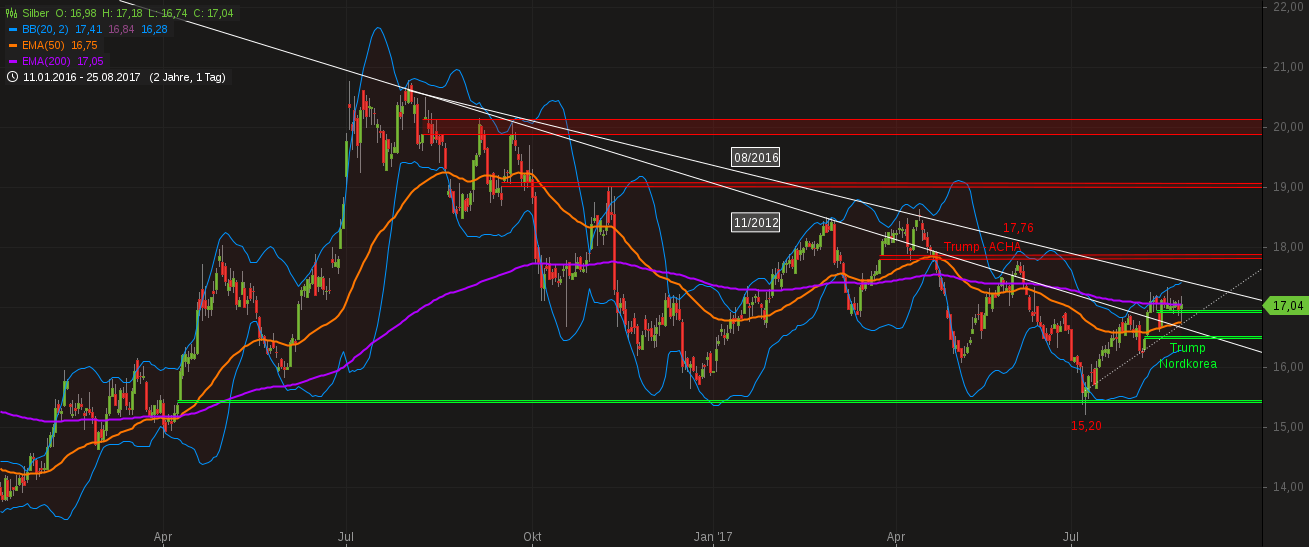 Trump hatte seine Waren vor 10 Monaten sehr überzeugend feilgeboten, ein Verkäufertyp halt; doch leider stellt sich immer mehr heraus, dass er nicht frei über seine Waren verfügen kann, ja, dass er sie zum Teil gar nicht mehr verkaufen will, sondern dass er jetzt ganz andere Produkte auf den Markt wirft; Produkte, die völlig anders geartet sind, als jene, die den potentiellen Käufern seinerzeit angeboten wurden, und so kann es nun passieren, dass seine Artikel nun zu Ladenhütern werden bzw. sich für seine neuen Versprechungen keine Käufer mehr finden könnten. Gold ist nun kurz davor, die Polonaise der abziehenden Kunden anzuführen. Charttechnik: Silber: Abgeblockt von der EMA 200 und unterstützt vom grünen Fenster (15.8.2017) war Silber in dieser Woche in eine schmalbandige Seitwärtsbewegung getrieben worden, aus der es nur intraday mal einen Blick darüber hinaus, mal hinauf, mal hinunter, wagte. Die für den Freitag eingestellten Jacksonhole-Orders zerrten dann erneut am Edelmetall, mal hinauf, mal hinunter, dieses Mal heftiger. Doch nach unten war an der EMA 50 sowie der Aufwärtstrendlinie 07.07.2017 bzw. der pullback-Abwärtstrendlinie 11/2012 Endstation, einem Dreierpack, welches als unüberwindbare Kreuzunterstützung den Bären im Wege stand; und nach oben ging es auch nicht viel höher rauf als an den Vortagen. Ergebnis des ganzen Freitags-Spektakels: ein potentieller Aussenstab für die Folgetage, einer, der selbst Bestandteil eines Aussenstabes ist, nämlich jenem vom Trump-Nordkorea-Fenster, einer dessen Kerzenkörper oberhalb einer Unterstützung liegt, welche zuvor ganze 6 Mal in Folge erfolgreich getestet wurde. Positiv zeigt sich der abgeleitete Indikator SSTOC: er konnte bei annähernd gleichbleibendem Silberkurs ordentlich abkühlen. Zur Erinnerung darf folgender Kurslevel erwähnt werden, der in der kommenden Woche seinen Stichtag haben wird: USD 16,82 (Schlusskurs) oder höher, am Do, 31.8.2017, und der Hammer vom Vormonat ist bestätigt. Um diesen Wert nicht zu erreichen, müsste Silber eine Dreifach-Kreuzunterstützung durchschlagen. Gold: Auch Gold driftete in einem engen Kursband seitwärts, knapp unterhalb zweier Widerstandslinien, deren Kreuzwiderstandswirkung erst langsam in den kommenden Tagen aufgrund des Auseinanderdriftens dieser Linien nachlassen wird. Unmittelbare Absicherung bietet immer noch das grüne Fenster (14.8.2017). Nachdem Gold in den vorangegangenen Tagen nicht einmal das leiseste Bedürfnis hatte, dieses Fenster testweise anzusteuern, tat Gold zumindest am Freitag dann so, als hätte es die Absicht, diese Unterstützung ernsthaft zu testen. Ganz runter wollte es zwar nicht, aber es näherte sich diesem grünen Fenster immerhin an. Auch Gold gelang mit dieser Seitwärtsbewegung ein Abkühlen des SSTOCs. Da Jacksonhole möglicherweise seine "endgültigen" Auswirkungen erst ab Montag am Chart ersichtlich machen wird, auch hier 2 Kurswerte, die in der kommenden Woche Bedeutung erlangen könnten. USD 1.274 (Schlusskurs) am Do, 31.8.2017 und die Aufwärtstrendlinie 12/2016 im Monatschart bleibt unbeschädigt. Dafür muss das bereits oben angesprochene Unterstützungsfenster halten. USD 1.239 (Schlusskurs) am Fr, 1.9.2017 und die Aufwärtstrendlinie 12/2016 im Wochenchart bleibt unbeschädigt. Hier müssten 3 Widerstände + eine 3-fach-Kreuzunterstützung durchschlagen werden. Barrick Gold: Hier hat sich das letzte verbliebene Seifenblasen-Fenster in Luft aufgelöst. Barrick zieht nach wie vor seine Seitwärtsbewegung knapp oberhalb des grünen Fenster (27.7.2017, Q2-2017) durch, wobei sein Handelsvolumen seither mit seinen Spitzenausschlägen, aber auch durchschnittlich, abnimmt. Mehr Handelsvolumen darf hier spätestens nach dem Labour-Day der Amis (4.9.2017) erwartet werden, wenn das Kapital wieder an den Bildschirmen sitzen wird, falls es nicht schon vorher zurückkehrt (Jacksonhole). Charttechnisch gibt es keine grossen Signale, die aus der Seitwärtsbewegung herausdeuten würden. Positiv ist die mittlerweile 4-monatige Seitwärtsbewegung als mögliche Bodenbildung zu ersehen, welche günstigerweise die EMA 50 und EMA 200 in einen synchronen Paarlauf in horizontaler Richtung überführt hat. Das Q2-Fenster ist nach wie vor eine solide Unterstützung. Bei einem Kurslevel höher als USD 17,41 würde ein neuer Aufwärtstrend begründet. Für die Generierung seines abwärts gerichteten Kollegen müssten 2 Unterstützungsfenster durchschlagen werden. Fazit: Zwar ging es diese Woche bei den Edelmetallen nur seitwärts (bei Barrick sowieso), doch war das ein gesundes, konsolidierendes Seitwärts: der SSTOC konnte sein erhitztes Gemüt abkühlen und damit die Basis schaffen für eine potentielle Monatsendrallye, welche die Edelmetalle aus ihrem – nach oben nur mehr schwach bewachtem – Gefängnis befreien könnte. Zu viele Unterstützungen nach Süden sollten Gold wenig Motivation liefern, in die südliche Richtung zu ziehen, und falls doch, dann eben nur bis zu diesen Unterstützungen und nicht tiefer (USD 1.240).