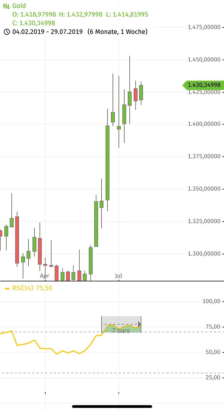 Außerdem ist Gold im Wochen-RSI seit 7 Wochen im überkauften Bereich. Das letzte mal war diese Extremsituation mit 8 Wochen zum Allzeithoch im August 2011.