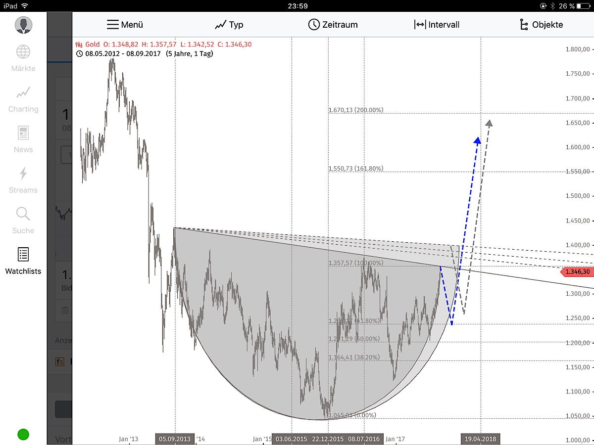 Für eine solche Formation benötigen wir noch einen Henkel, der die jungen Bullen mit knappen Stop-Loss-Order wieder heraus katapultiert und die Bären endgültig das Lager wechseln. Nach meinem Empfinden fehlt noch ein finaler Sell Off bei Gold.