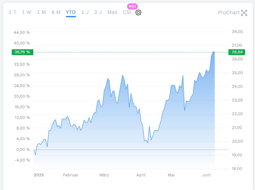 Zum einen hat man einen doppelten Boden ausgebildet und zusätzlich den mittelfristigen Abwärtstrend seit 2023 im Mai mustergültig nach oben verlassen. Dann hat man nach mehreren Anläufen den Widerstand bei ca. 25 Euro nach oben durchbrochen und somit einen kurzfristigen Aufwärtstrend seit Dezember 2024 ausgebildet. Vor kurzen hat auch noch die 38-Tage-Linie die 200er Linie von unten nach oben recht steil durchbrochen.