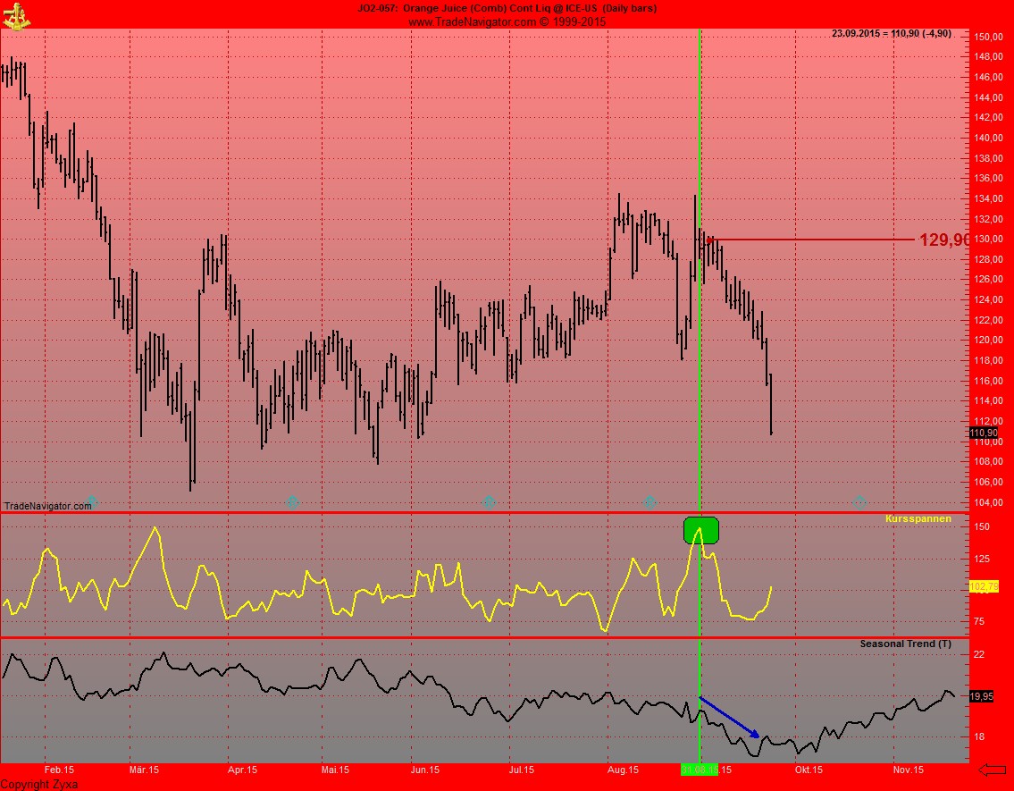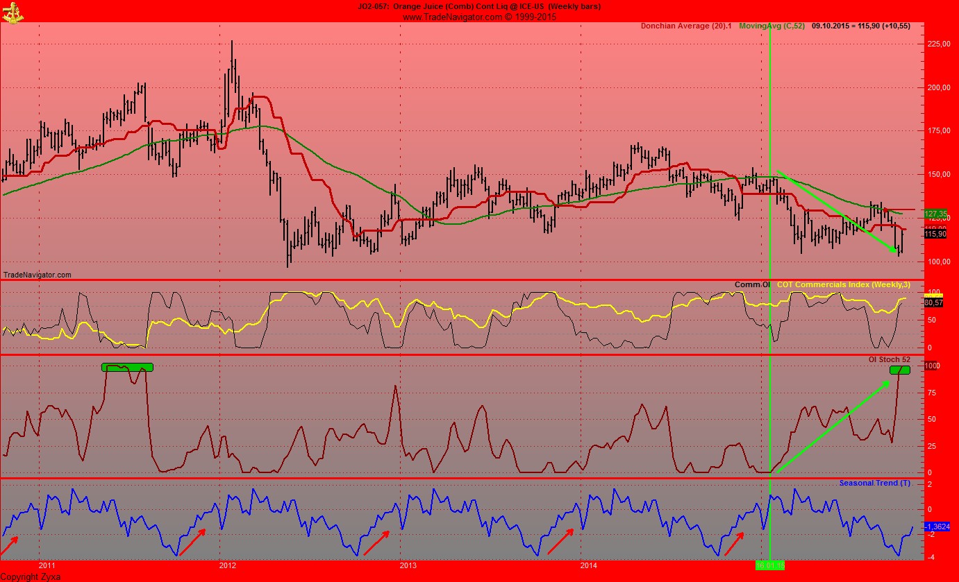 Meine Trades zeigen, wie man auch bei Orangensaft sieht, haette man eigentlich jedes mal, wenn der Commindex auf 100% long steht, kaufen koennen. Mit Ausnahme ende 2014 vielleicht, da waehre man wohl mehrere Male frustriert ausgestopt worden.