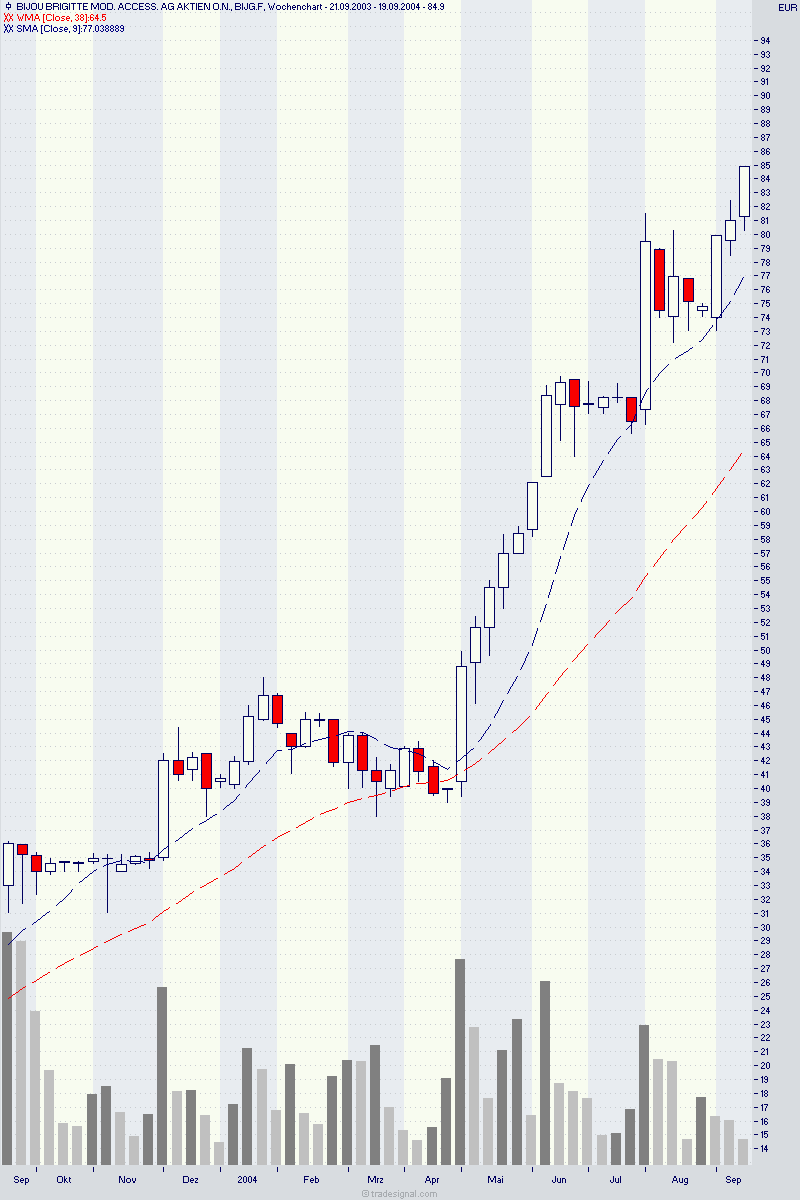 Hamburg, 16. März 2005 - Der Hamburger Modeschmuckkonzern Bijou Brigitte erhöhte das Konzernergebnis vor Steuern in 2004 um 52,7 % auf 75,3 Mio. EUR (Vorjahr: 49,3 Mio. EUR). Nach Steuern stieg der Konzernüberschuss von 32,6 Mio. EUR im Vorjahr um 45,7 % auf 47,5 Mio. EUR im Geschäftsjahr 2004 und erreichte damit erneut einen Spitzenwert. Der Konzernumsatz hat sich im Berichtsjahr um 35,5 % auf 223,4 Mio. EUR erhöht (Vorjahr: 164,9 Mio. EUR). Flächenbereinigt ergab sich ein Umsatzplus von 13,9 %. Hierbei handelt es sich um vorläufige Zahlen, vorbehaltlich der Bestätigung seitens der Wirtschaftsprüfer und der endgültigen Genehmigung des Aufsichtsrats.