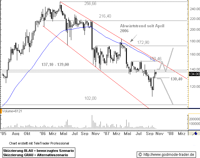 Rückblick: Die BIJOU BRIGITTE - Aktie befindet sich seit April 2006 nach ihrem Allzeithoch bei 256,66 Euro in einer deutlichen Abwärtsbewegung. Dabei fiel sie zunächst auf die Unterstützungszone 137,10-139,00 Euro. Mitte August 2007 durchbrach die Aktie diese Zone und fiel auf 109,75 Euro zurück. Von dort aus erholte sie sich in den letzten beiden Wochen bis an die Zone 137,10-139,00 Euro. Knapp darunter notiert die Aktie aktuell.