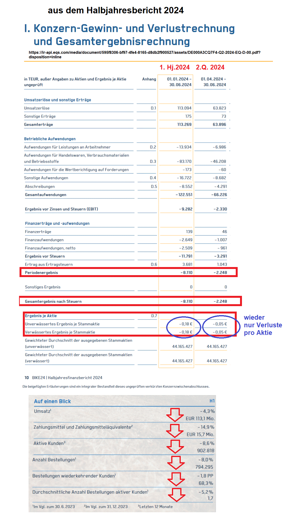 Einer der Märchenonkel macht den Abgang. Hat wohl ausgesorgt. CFO Timm Armbrust verlässt BIKE24, nachdem er sich dort jetzt 9 Jahre lang die Taschen prall gefüllt hat und eine jahrelange Verluststrecke vorzuweisen hat. 24er Zahlen weiter schwach. Und nie vergessen: EBITDA ist Firlefanz für Narren die sich für blöd verkaufen lassen. Das noch stärker aufgehübschte "bereinigte" EBITDA .. ach als der böse "Dreck" ist weg ... ist für absolute Volltrottel die sich auch den letzten Käse als Kennzahl unter die Nase reiben lassen. ( => https://www.forbes.com/sites/brentbeshore/2014/11/...-is-bs-earnings/ "Charlie Munger, expressed Berkshire Hathaway’s position on this particular formula best: “I think that, every time you see the word EBITDA, you should substitute the word ‘bullshit’ earnings.”.... Again, I’ll leave it to Warren Buffett to explain:“People who use EBITDA are either trying to con you or they’re conning themselves..." ). Auch das Jahr 2024 hat man, wenig verwunderlich, wieder desaströs mit Verlust auf Konzerngewinnebene abgeschlossen und der Umsatz stagnierte weiter auf niedrigem Niveau. Der Laden bleibt weiter ein Stolz der deutschen Unternehmenslandschaft.