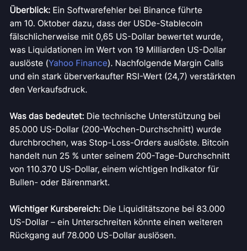Der Bitcoin hat seine Talfahrt am Freitag beschleunigt fortgesetzt. Zwischenzeitlich sackte der Kurs am Morgen Richtung 82.000 US-Dollar. Zuletzt erholte sich der Bitcoin etwas. Die wichtigste Kryptowährung kostete auf der Plattform Bitstamp 83.800 Dollar. Das sind aber immer noch rund 4.000 Dollar (Dollarkurs) weniger als am Vorabend. Aus Sicht von Marktanalyst Timo Emden von Emden Research herrscht "Ausverkaufsstimmung" am Markt. "Die Nerven bei Anlegern liegen derzeit blank", betonte er. Eine Kombination aus Zinsängsten, der Auflösung gehebelter Positionen und Gewinnmitnahmen lasse Investoren Reißaus nehmen. Nun stehe auch das Vertrauen der hartgesottenen Bitcoin-Anleger auf dem Spiel, mahnte er. Es bestehe die Gefahr, dass sich aus der Kurskorrektur eine handfeste Vertrauenskrise entwickele. "Wir sehen derzeit einen Crash auf Raten", mahnte der Experte. Jeder Erholungsversuch werde abverkauft, was die Verzweiflung zum Ausdruck bringe.