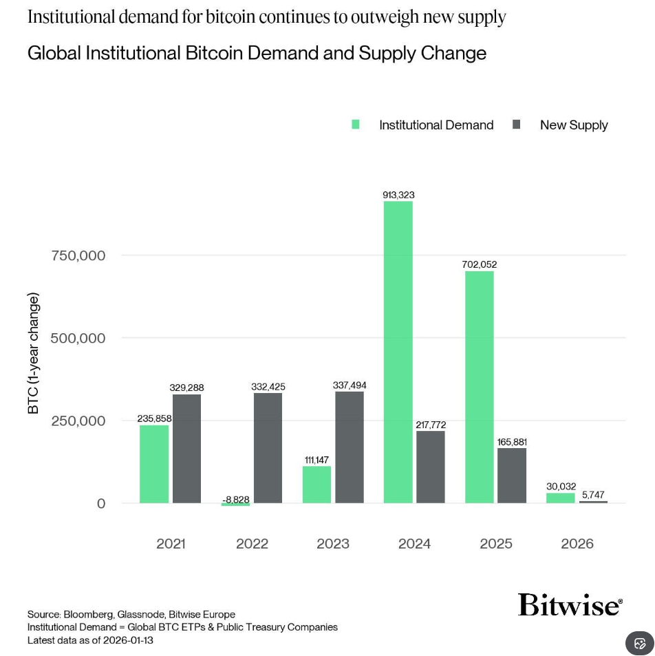 Rund 30.000 BTC wurden 2026 schon von institutionelle Anlegern gekauft, während nur 5.700 BTC neu geschürft wurden.