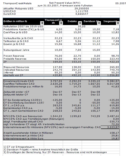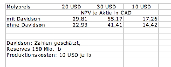 Wenn ich aus meiner letzten hier veröffentlichten NPV-Projektion, die bei 29,81 CAD endete (Grundlage Molypreis 20 USD für die nächsten 10 Jahre) die mit 743,59 Mio. CAD antizipierte Davidson-Mine ausklammere, komme ich auf 22,93 CAD als inneren Wert. Meine NPV-Projektion liegt somit fast exakt am Kursziel dieser Bank.