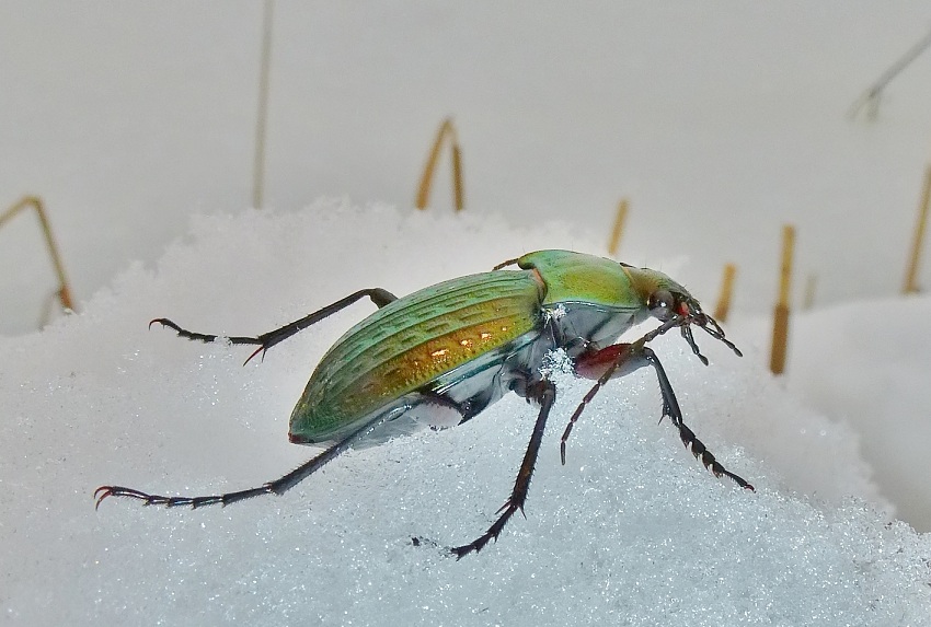habe ich diesen Laufkäfer regungslos im Schnee gefunden.