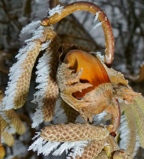 Das Weiße ist Reif. Diese Haselnussart ist eine Mutation