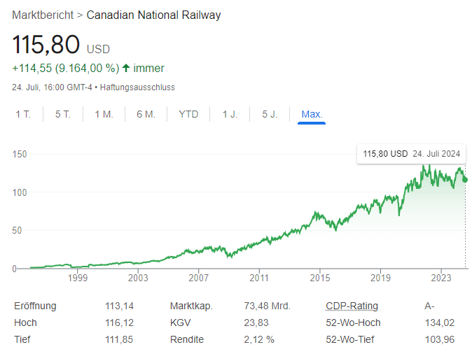Der faire Wert der Aktie liegt bei einem KGV zwischen 16 und 18. Derzeit notiert CN mit einem KGV von ca. 20, also leicht ueber dem Einstiegsbereich. Ruecksetzer durch Streiks, Naturereignisse oder konjunkturelle Dellen koennten attraktive Einstiegschancen bieten.