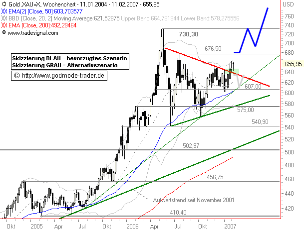 Gold: Inflationsängste nähren die Rallye Die amerikanische Notenbank malt wieder Inflationsgefahren an die Wand. Gleich drei Fed-Präsidenten hielten heute Reden, bei denen die Gefahr zu stark steigender Preise angesprochen wurden. Quasi als Bekräftigung kletterte der Ölpreis heute über die 60-Dollar-Marke. Damit gab es heute genug Nahrung für die Fortsetzung die Gold-Ralley. Gold gewann heute weitere 9,50 Dollar und schloss auf 672,30 Dollar. Das ist ein Wochengewinn von 20,80 Dollar, also 3,2%. Silber stieg um 14,5 Cent auf 13,91 Dollar. Im Vergleich zur Vorwoche verbesserte sich das Metall um 4%. Platin wurde um 3,50 Dollar teuer und beendete die Woche auf 1.201 Dollar.