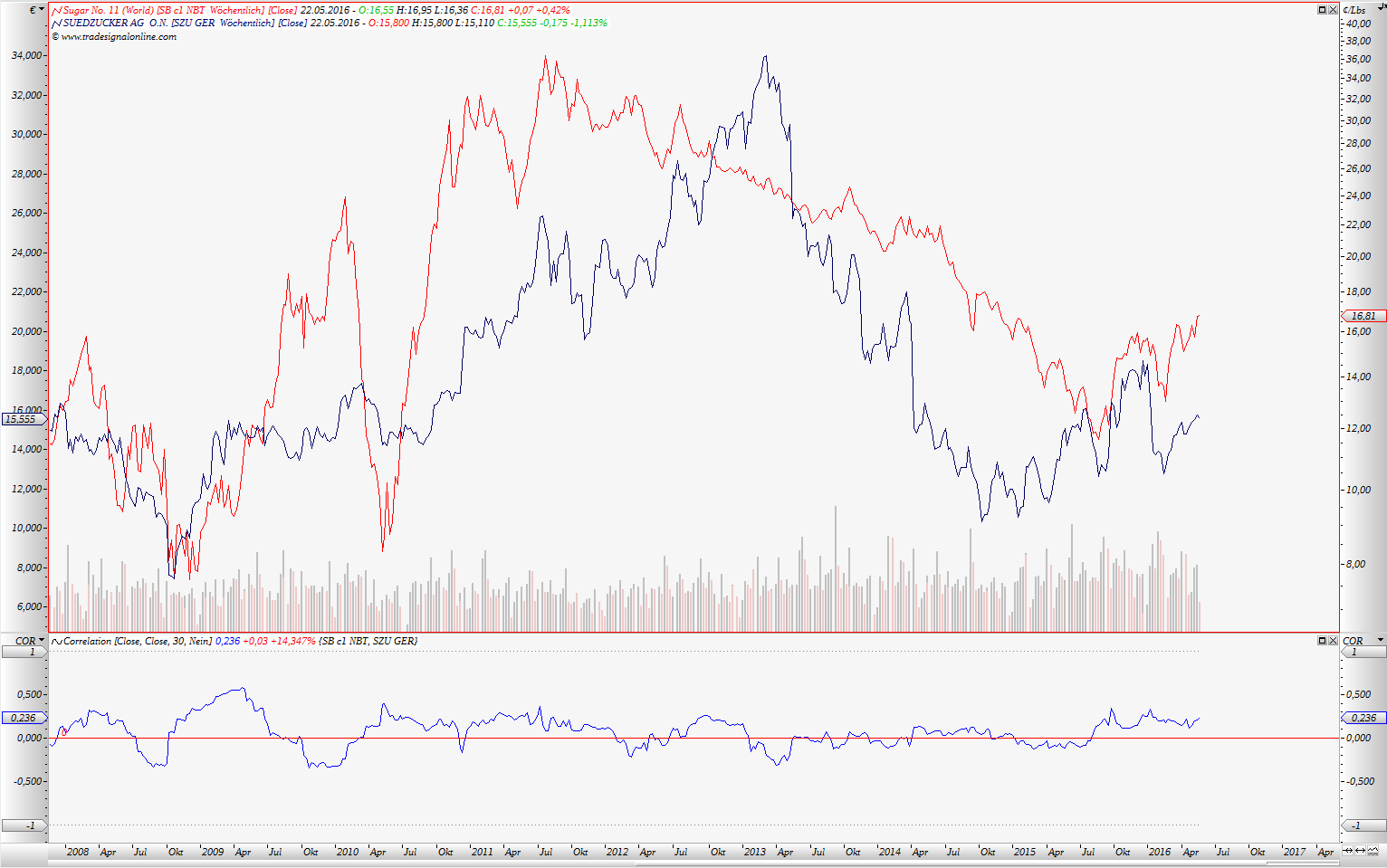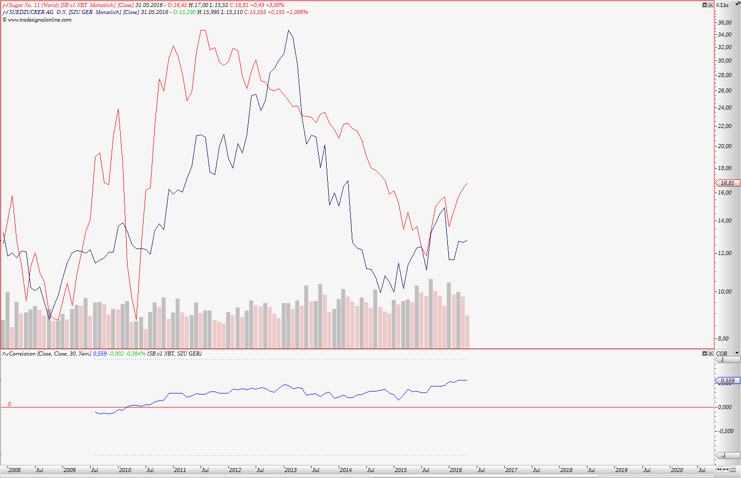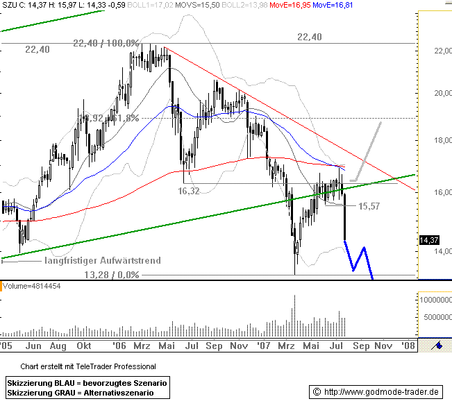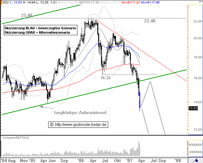 Rückblick: Die SÜDZUCKER Aktie startete im Februar 2000 nach einem Tief bei 9,85 Euro zu einer langfristigen Aufwärtsbewegung. Diese führte die Aktie bis März 2006 auf ein hoch bei 22,40 Euro. Danach fiel die Aktie zunächst auf 16,32 Euro ab, welche sie Mitte Juni 2006 markierte. Dieses Tief durchbrach die Aktie Ende Februar 2006. Seitdem gibt die Aktie sehr stark nach. Der langfristige Aufwärtstrend ist bereits signifikant gebrochen und verläuft aktuell bei 15,73 Euro. Nach den starken Verlusten der letzten Wochen ist die Aktie bereits wieder stark überverkauft aus indikatorentechnischer Sicht.