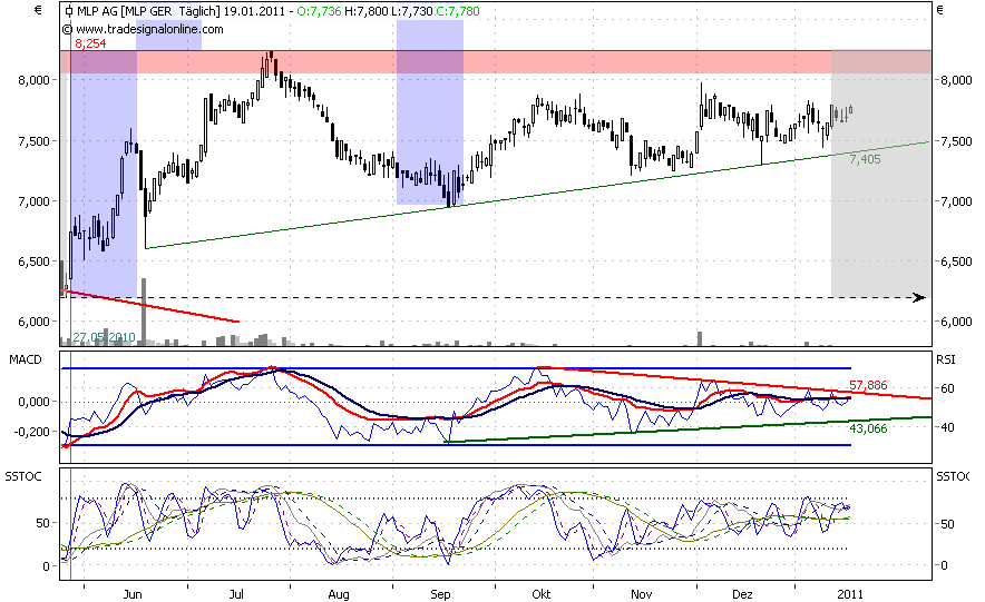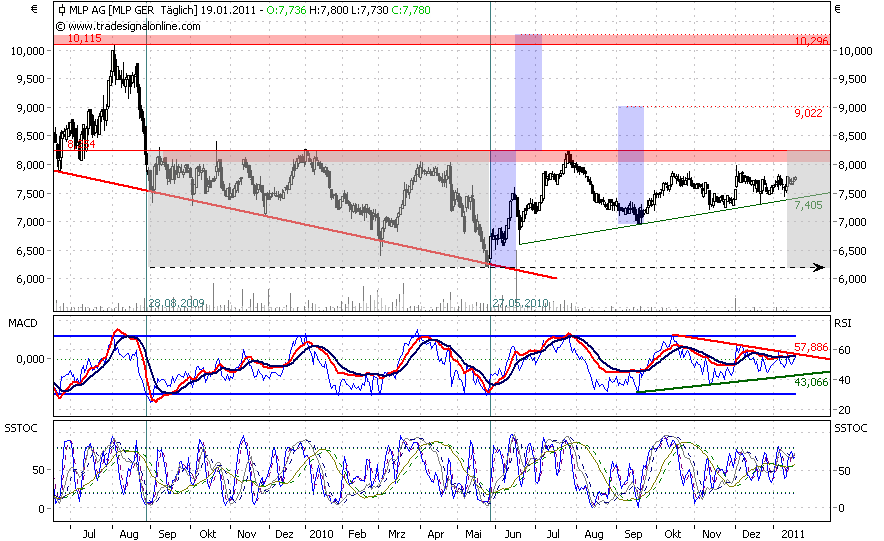 Danach raten die Experten vom "Performaxx-Anlegerbrief" zum Long-Einstieg in die MLP-Aktie mit einem engen Stopp-Loss-Limit bei 7,40 Euro. Das charttechnische Kursziel liege bei 14 Euro. (Ausgabe 3 vom 22.01.2011) (25.01.2011/ac/a/nw)