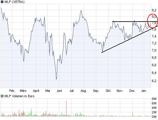 Die charttechnische Dreiecksformation gehe bei MLP ihrem Ende entgegen. Eine Entscheidung stehe unmittelbar bevor. Derzeit gehe man von einem positiven Verlauf aus, der mit Bruch der Dreieckslinie bei 8 Euro ein Kaufsignal initialisieren sollte.