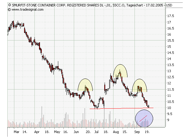 Möglich wäre jetzt ein Doppeltief im Bereich von 10USD oder ein weiter Verlust in Richtung 9,00USD als Ziel aus der SKS und als untere Begrenzung des aktuellen Abwärtstrends.