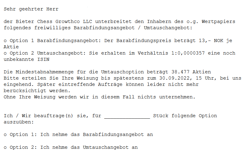 With this in mind, and as was mentioned in our Q2 report, as we received the offer from chess.com, the Board believes that the offer premium of 44% to the 3month trading is significant and attractive. Looking at how other peers have been performing on the Norwegian market over the past month, it's possible that this premium would have been even higher should the offer have come today. Importantly, we would also mention that it's necessary to consider the offer in the context of the valuation multiples across our peers and our growth rates rather than historical share prices.