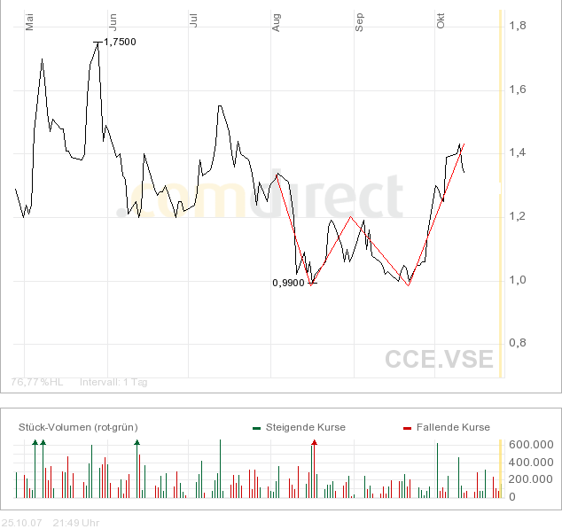 Commerce Investoren haben ihre Warrants, die am 27. September ausgelaufen sind, vollständig ausgeübt. Das hat zwei erfreuliche Effekte: Erstens fließen Commerce insgesamt nochmals Barmittel in Höhe von 6 Mio. CAD zu. Zweitens dürfte ab sofort der Druck von der Aktie weg sein, denn es ist zu vermuten, dass mancher Warrant-Halter seine neuen Aktien (bei 0,45 CAD) durch den Verkauf von CCE-Aktien finanziert hat. Am Freitag ging der CCE Kurs prompt auf 1,15 CAD im Schlusskurs. Mit positiven News könnte bei CCE eine neue Kursrallye bevorstehen!