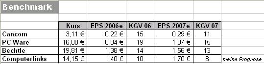 Zum einen wächst Computerlinks extrem stark. Umsatzseitig in diesem Jahr bislang um 53,8% und im Überschuss um 35,8%. Im Q3 alleine um 44,5% bzw. 89,0%. Die weiteren Aussichten für den Vertreiber von Sicherheits-Software in einem stark wachsenden Markt sind glänzend. Werden im starken Q4 "nur noch" 20% Überschuss-Wachstum erreicht, erzielt Computerlinks ein EPS von 0,59 € sowie 1,40 € für das Gesamtjahr 2006. Damit liegt das KGV 2006 bei 10. Für das laufende Jahr 2007 hat Computerlinks - in gewohnt konservativer Manier - ein Umsatzwachstum von 23% auf 480 Mio. sowie den Anstieg des EPS von 1,31 € auf 1,60 € angekündigt. Selbst bei dieser (viel zu) konservativen Prognose läge das aktuelle KGV 2007 bei 8,8. Da Comupterlinks "nur" ein Soft- und Hardware-Händler ist, lag die Ertragsentwicklung in der Vergangenheit hinter dem Umsatzwachstum zurück. Mit zunehmender (Umsatz-)Größe hingegen sollte die Ertragskraft gesteigert werden, was eine zusätzliche Dynamik bringen dürfte. Realistisch ist somit ein EPS-Anstieg auf etwa 1,80 € in 2007, was das KGV auf günstige 7,8 reduziert.