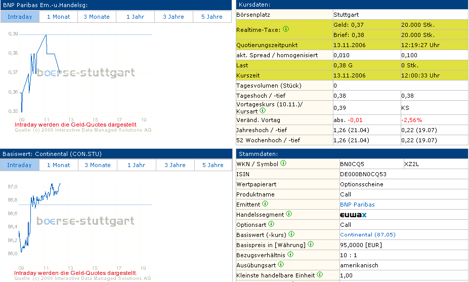 Continental bewegte sich in einem langjährigen Aufwärtstrendkanal, aus diesem ist sie im April signifikant nach oben ausgebrochen. Die weltweite Konsolidierung im Mai 2006 hat eine Verkaufswelle ausgelöst und die Aktie bis 71€ fallen lassen. Durch eine umgekehrte S-K-S-Formation hat sich die Aktie in den Trendkanal zurückgekämpft. Nach einer kurzen Kursberuhigung haben sich die Bollinger-Bänder verengt und deuteten dadurch auf eine bevorstehende starke Bewegung hin. Das Ergebnis ist eine neue Korrektur und der Kurs ist bereits bis zum Trendkanalboden abgefallen.